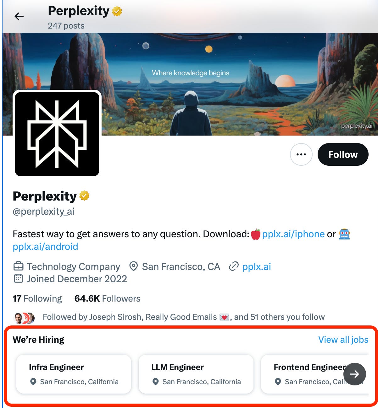 But, for example: if you are a Verified Organization (with the Gold sign), you can see the open roles in the X profile of the company. An example of Perplexity AI: