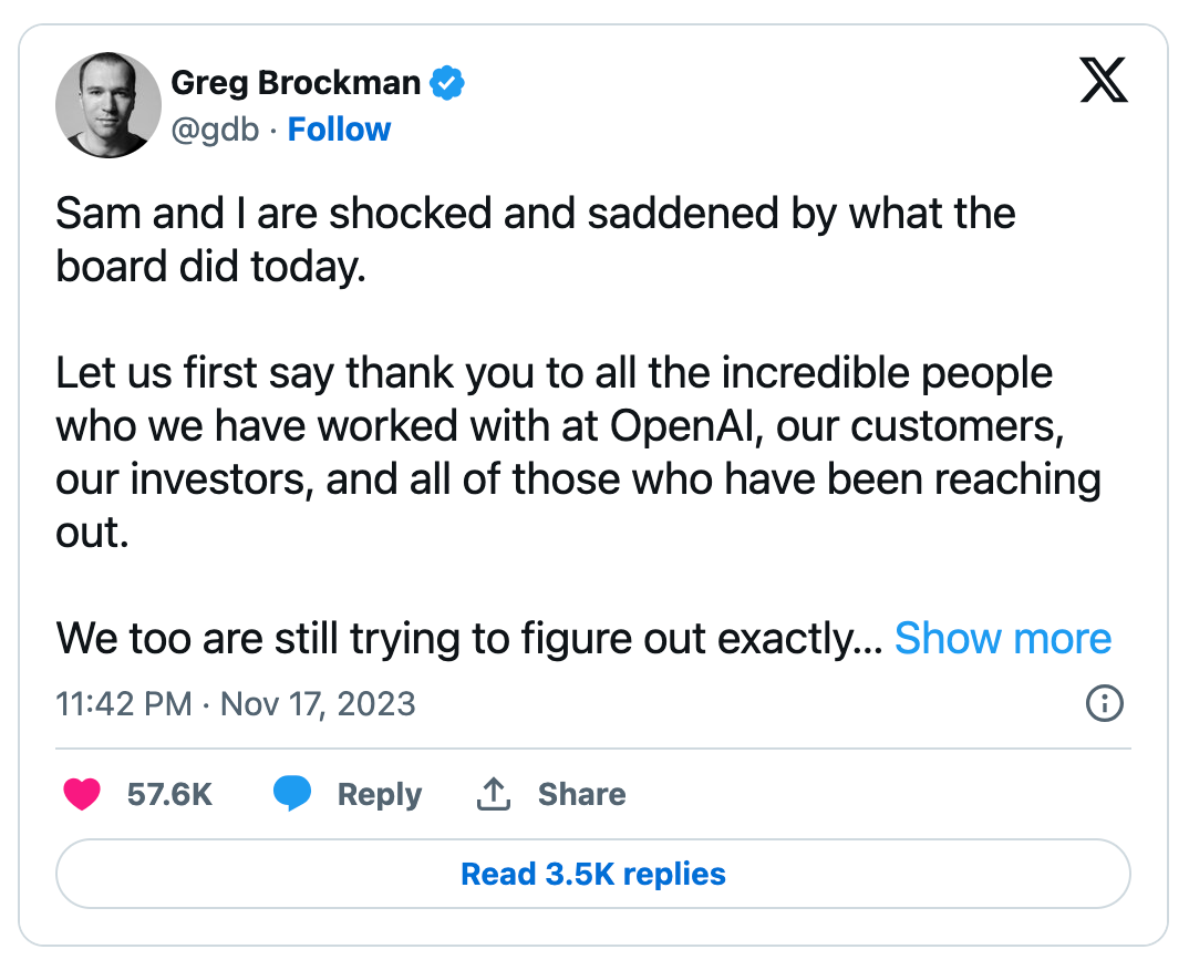 Yesterday a seismic bomb was out: Sam Altman was replaced as CEO of OpenAI, Greg Brockman (President of OpenAI, co-founder and board member) was removed from the board first, and after that, he quit.