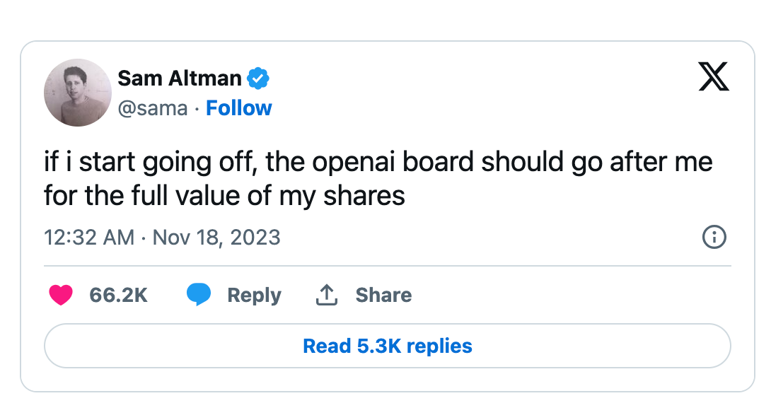 Why? Sam, Greg (and the amazing team there) created a monster from 0 to $80 Billion. A lot of value was created, and still: he was fired for a “misalignment with the board”?