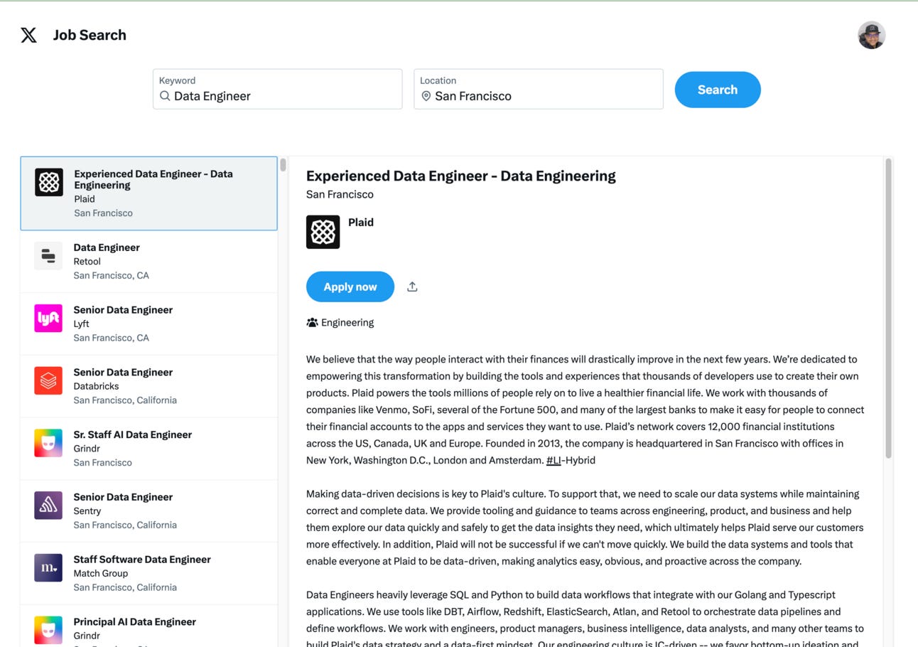 Outside of the OpenAI drama, there is good news for job seekers: X just launched its Jobs platform: x.com/jobs, and if you make a quick search for Data Engineer positions in San Francisco, there are a lot of open roles there: